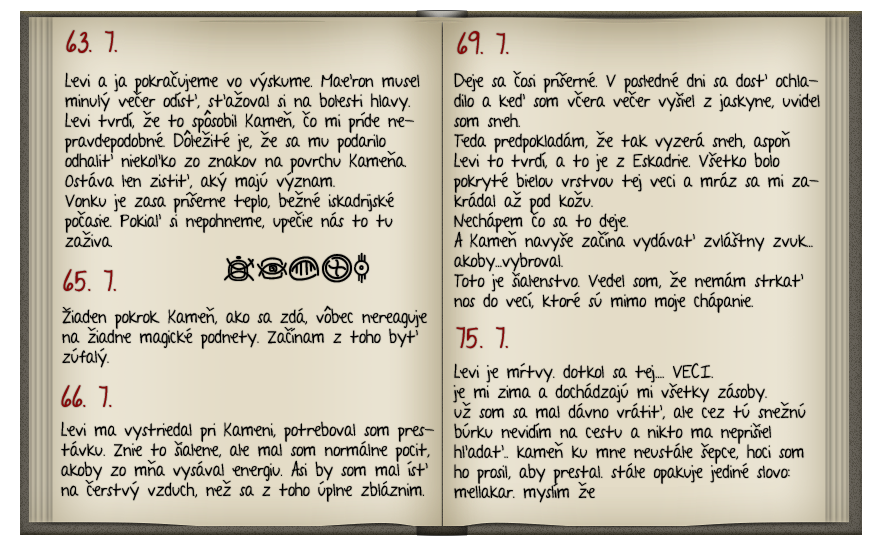 „To je otcov denník. Posledné dve strany sú asi najdôležitejšie. Nemáme čas, aby sme to mohli prejsť všetko. Otec písal, že ten Kameň akoby šepkal. Netuším, či bol vtedy ešte mentálne v poriadku, ale mohli by sme to slovo vypátrať v knižnici v Paláci. Tie knihy, chvalabohu nikto ešte páliť nezačal.“